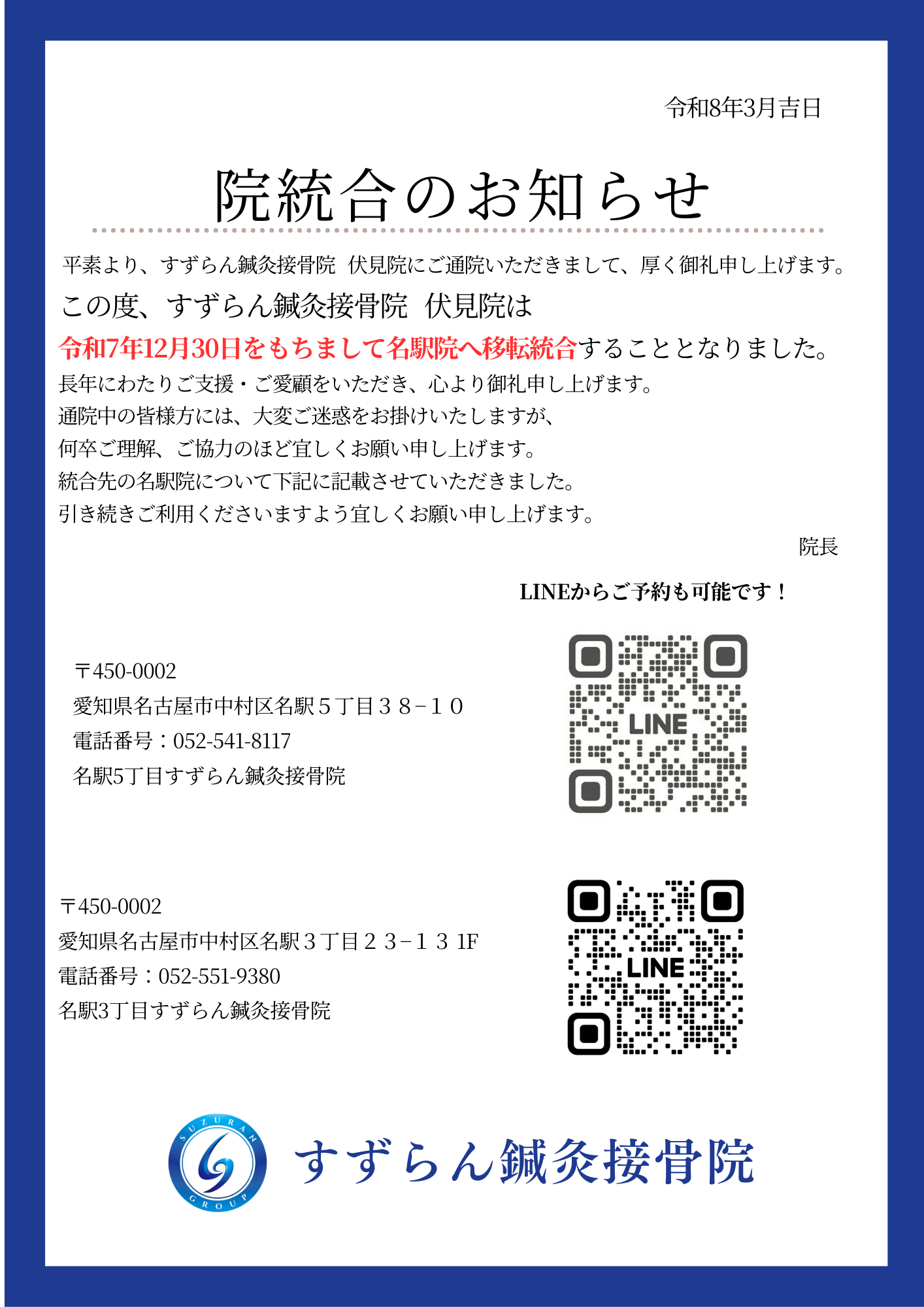 平素より当院をご利用いただきありがとうございます。この度、伏見院は名駅院へ移転統合することとなりましたのでお知らせいたします。